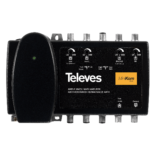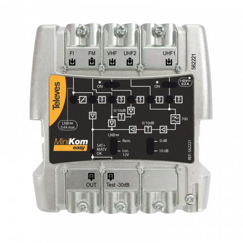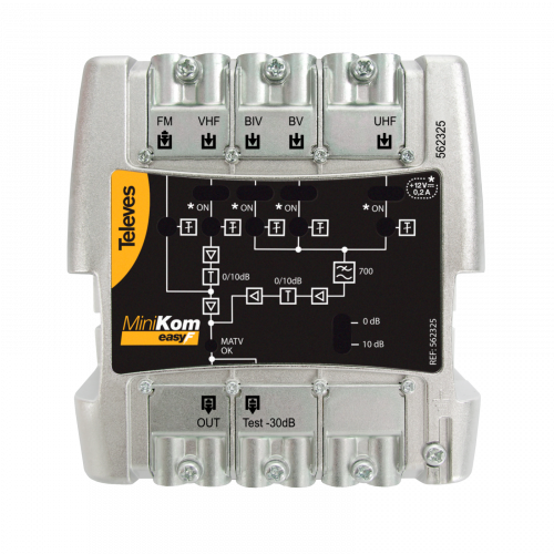 Central banda ancha MiniKom EasyF 5 entradas: FM-VHF-UHF-21..32-36..48562325Central amplificadora configurable de cabecera para sistemas MATV con amplificación separada que garantiza la ausencia de intermodulación entre entradas.