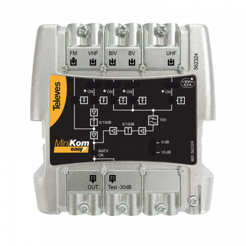 Central banda ancha MiniKom EasyF 4 entradas: FM-VHF-UHF-UHF562422Central amplificadora configurable de cabecera para sistemas MATV con amplificación separada que garantiza la ausencia de intermodulación entre entradas.