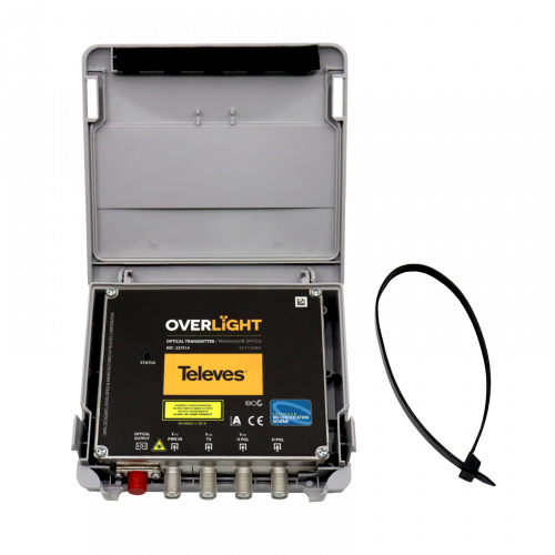 Transmisor óptico Overlight CWDM Uso exterior, DAB/UHF/SAT, 1310nm, Po 10dBm237513Transmisor óptico CWDM específicamente diseñado para su instalación en intemperie, a poca distancia del LNB. Recibe la señal satélite procedente de un LNB RF WideBand y banda terrestre y la envía hasta a 64 usuarios, a través de una salida de fibra en la ventana de 1310nm con 10dBm de potencia óptica.