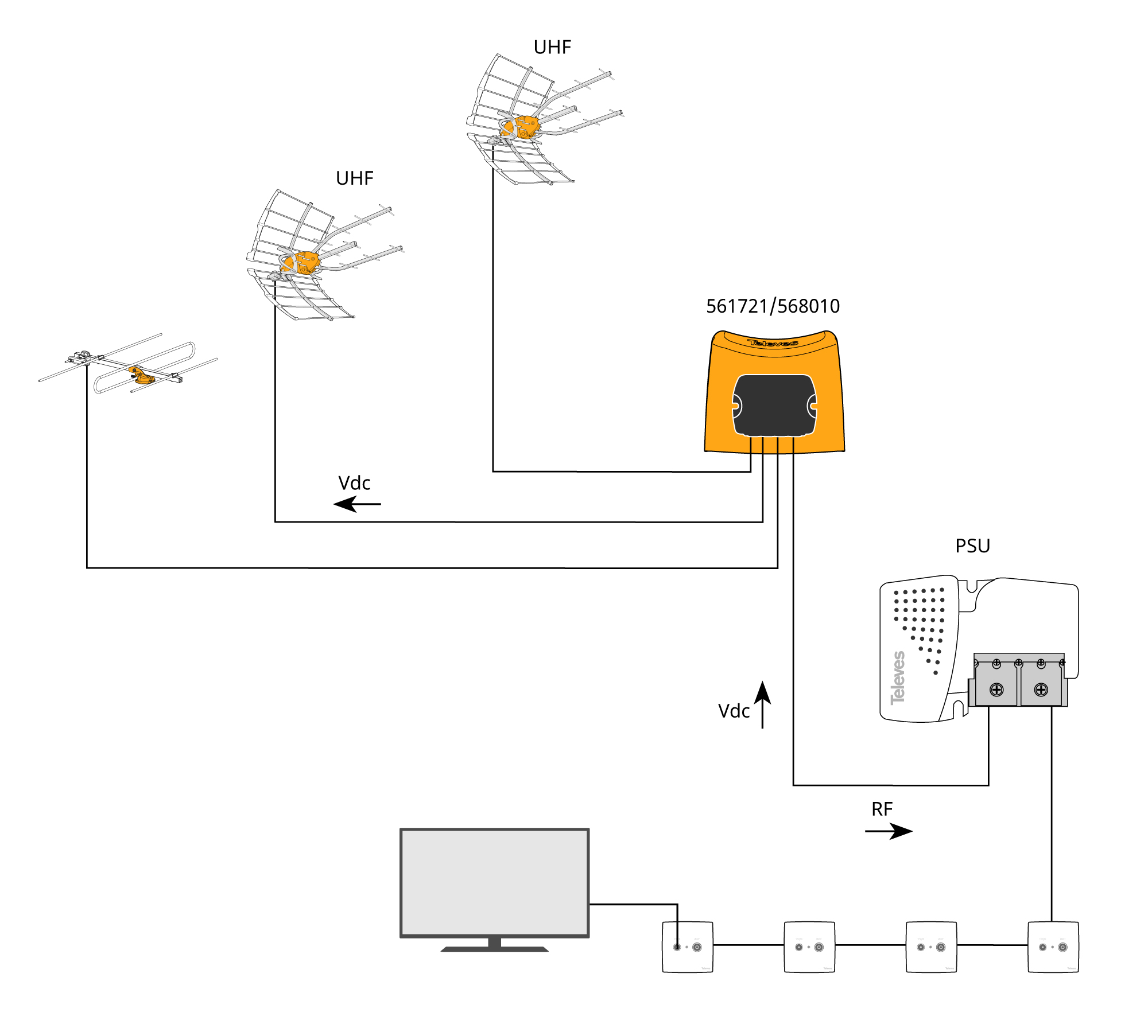 Ausgestattet mit 3 Eingängen: Die Signale an den beiden UHF Eingängen werden verstärkt, die VHF-Signale hingegen werden 1:1 durchgeschleift. Der Verstärker wird über das Koaxkabel des Ausgangs gespeist.