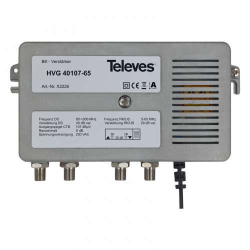 Dieser BK-Verstärker ist besonders für den Einsatz in Mehrfamilienhäusern ausgelegt und deckt durch seine flexible Konfigurationsmöglichkeit mit Steckbrücken mehrere Verstärkerklassen ab. Die Verstärkung im Vorwärtsbereich beträgt 40 dB; Die Verstärkung im Rückkanal ist 29 dB. Der Frequenzbereich bis 1006MHz erlaubt auch einen Einsatz in DOCSIS-Netzwerken.