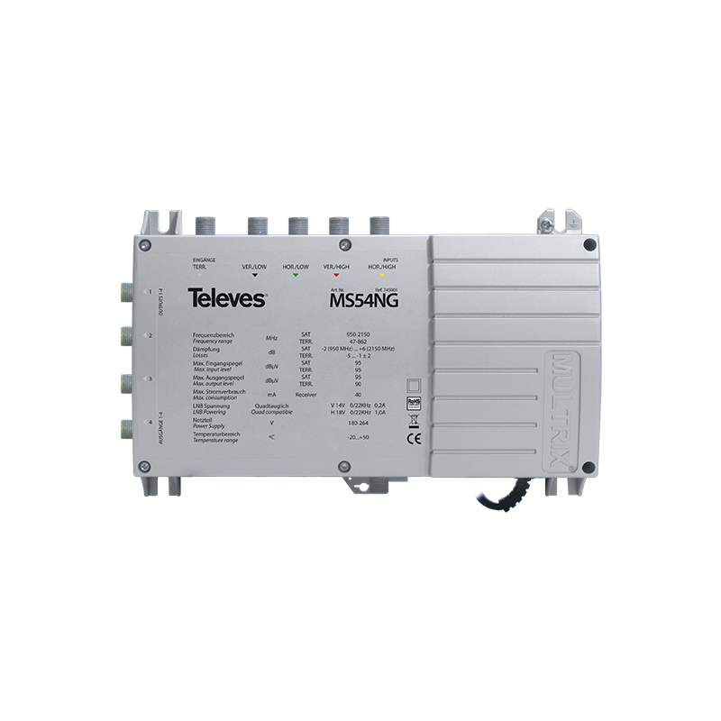 Die MULTRIX-Gussmultischalter-Serie besticht durch ihre hervorragende Technik und Vielseitigkeit. Leistungsstarke terrestrische-und SAT-Verstärkerstufen mit integrierter Entzerrung stellen einen gleichmäßigen Signalpegel auch bei längeren Leitungen zur Verfügung. Das integrierte stromsparende Schaltnetzteil stellt die Versorgung des Speisesystems sowie der terr. Verstärkerstufe sicher. Neben der Standard-Wandmontage besteht, durch speziell angebrachte Hutschienenelemente, die Möglichkeit zur Montage in Schaltschränken