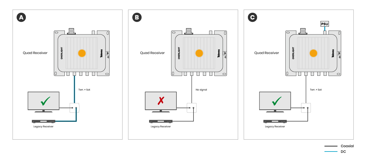 - Multiple powering options: remotely through the receiver (STB) or via power supply