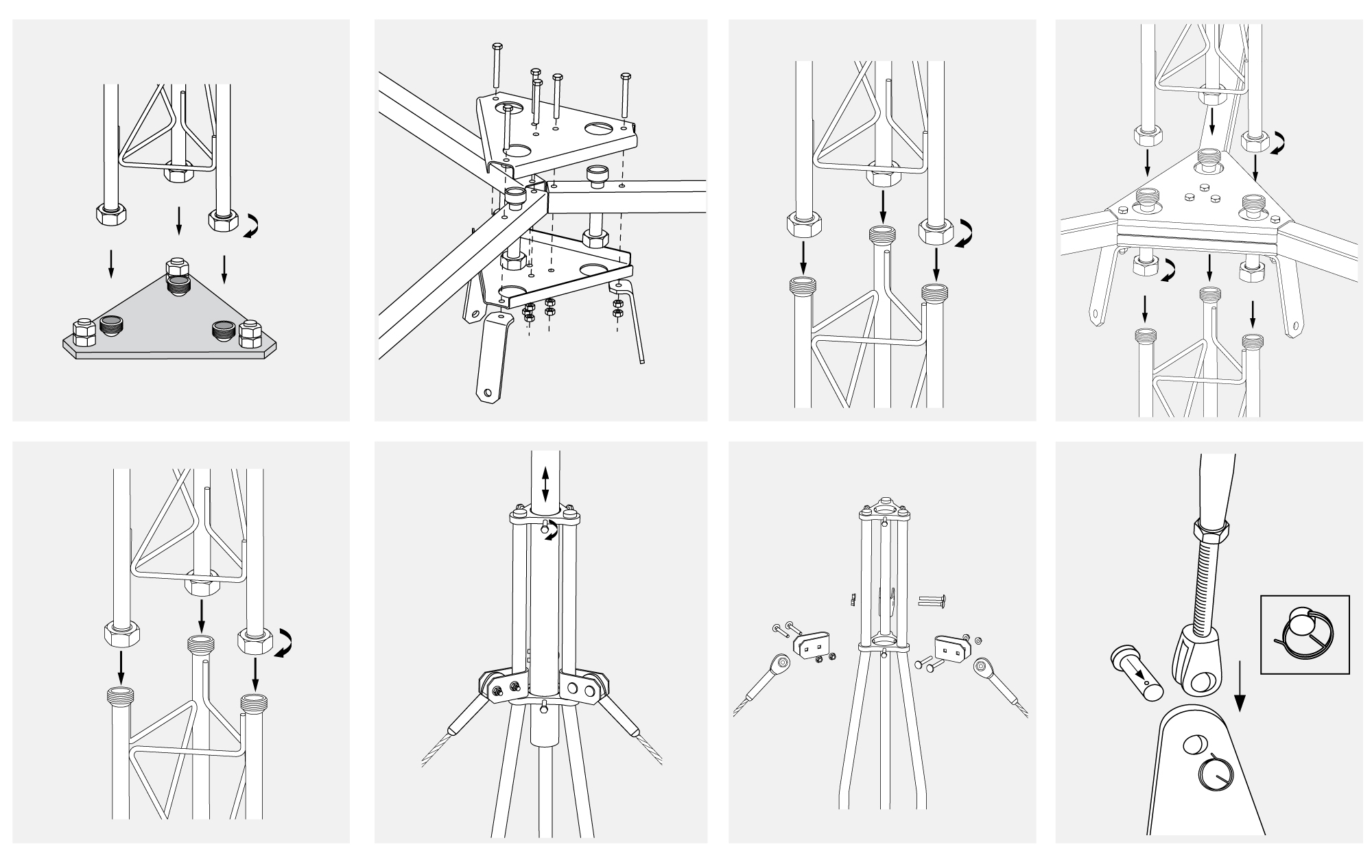 | tlv_diferencias | Kit, including: 3 Middle Sections of 3 m 1 upper section of 3m 1 mast of 3m 1 guy wire anchoring cross head 3 cables - Ø 4mm 6 cables - Ø 5mm Turnbuckles, screws, clamps and accessories. |