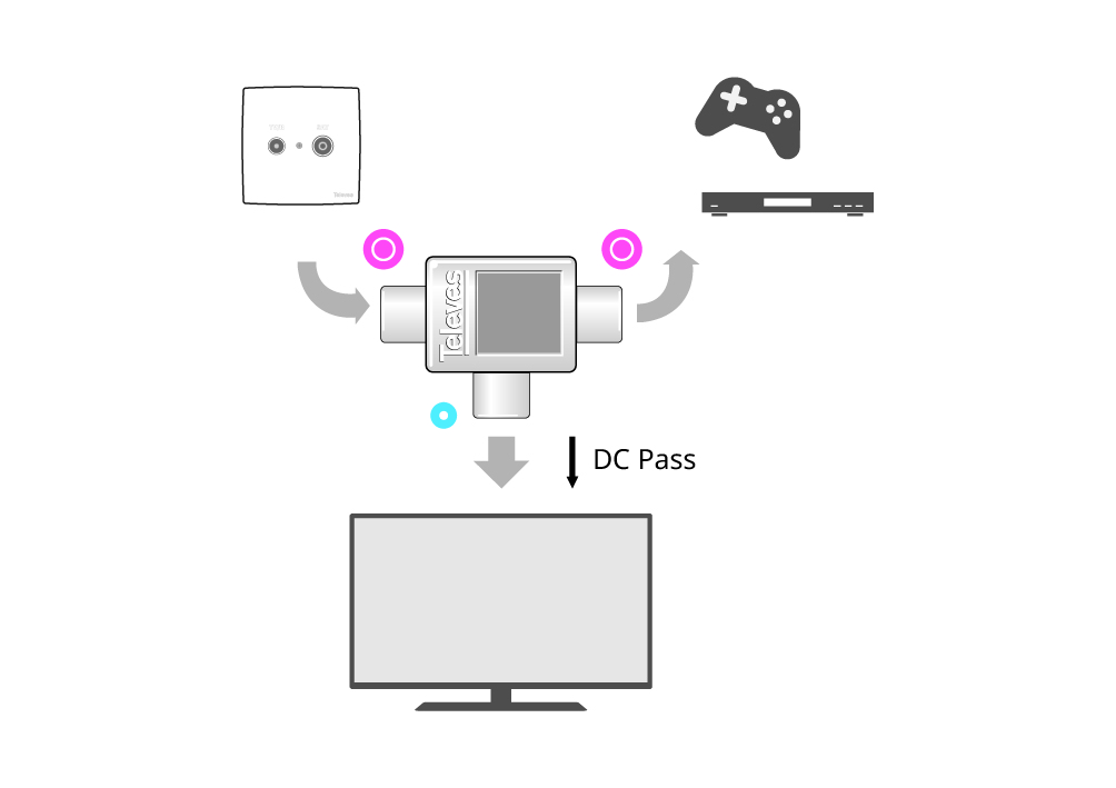 2-way inductive Splitter and IEC connectors for TV signals. Equipped with one male connector, the remaining connectors being female.