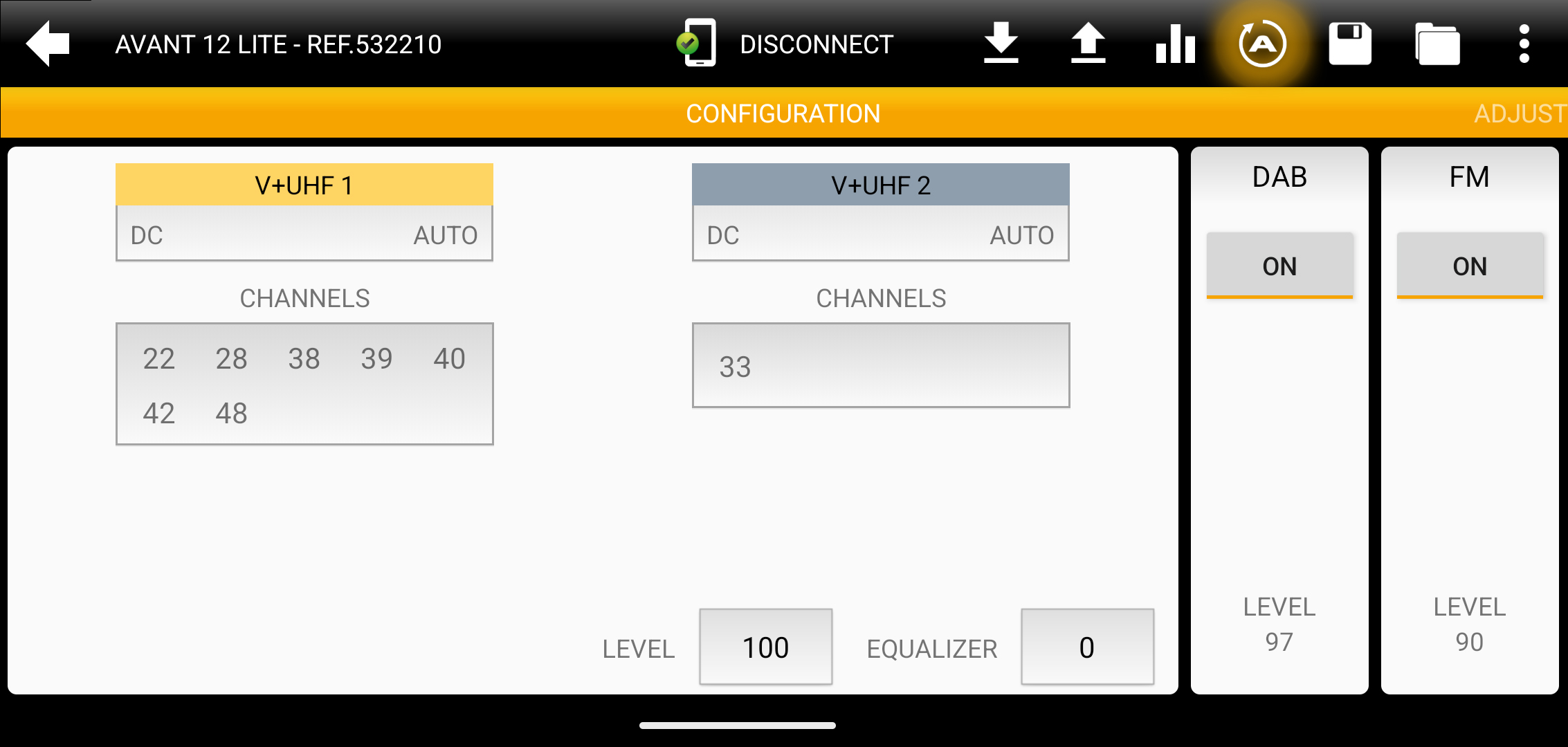 Thanks to the built-in Bluetooth® antenna, it is possible to carry out advanced programming of the multiband amplifier wirelessly from a smartphone or tablet (Android/iOS), with the ASuite application. With this application, the professional user can perform a wide range of functions: