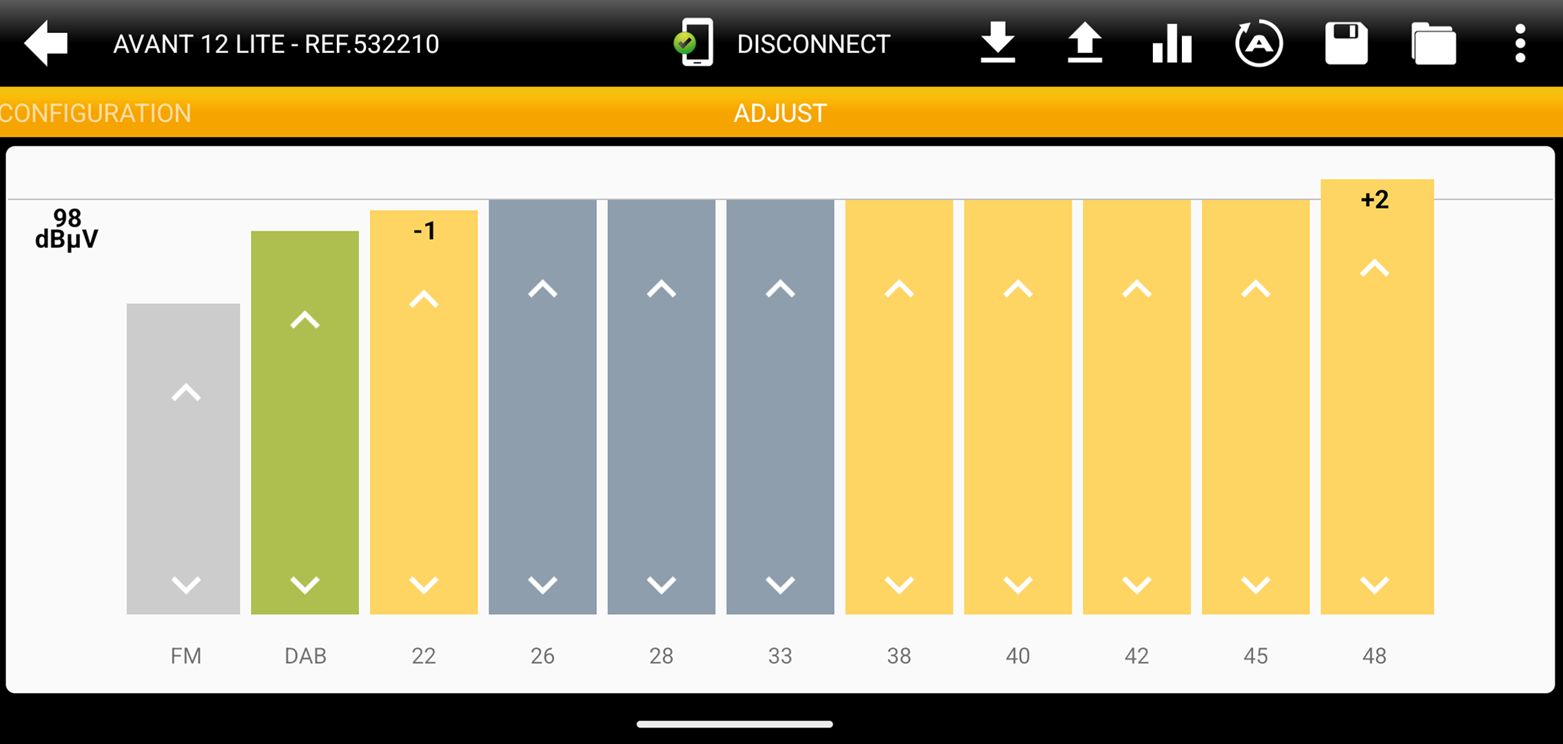 ASuite allows a further adjustment of ± 3dB to the previously autoadjust. It is carried out manually and independently for each filter, for those channels that require a finer adjustment.