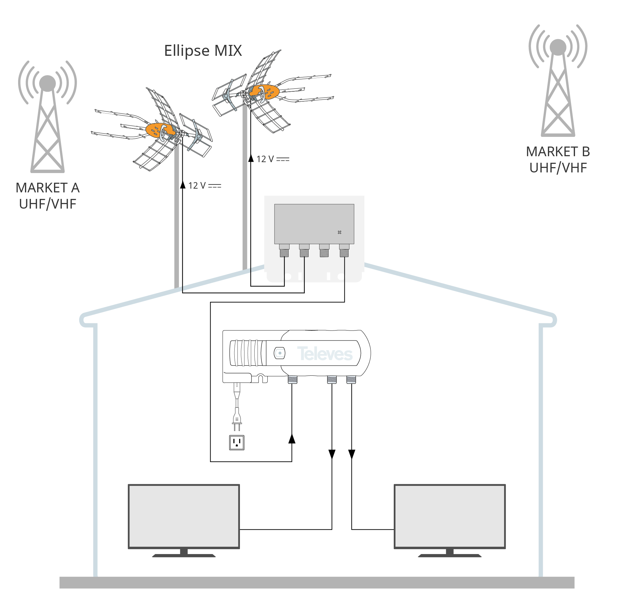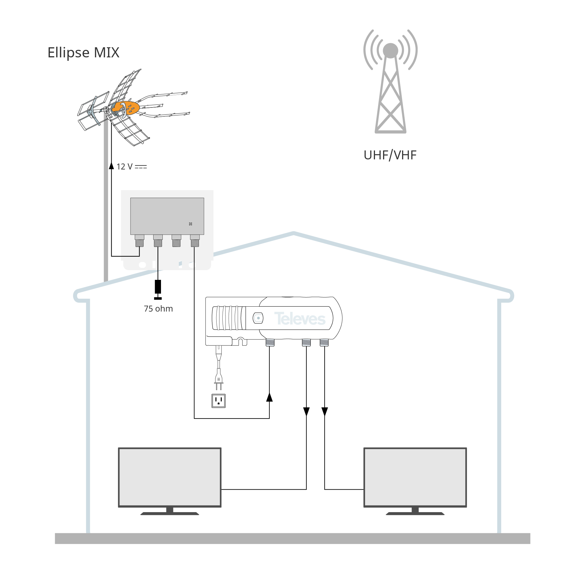 - Dual band amplification: the VHF and UHF gains are adjusted independently according to the needs of each band. This also helps avoid intermodulation interference between the bands