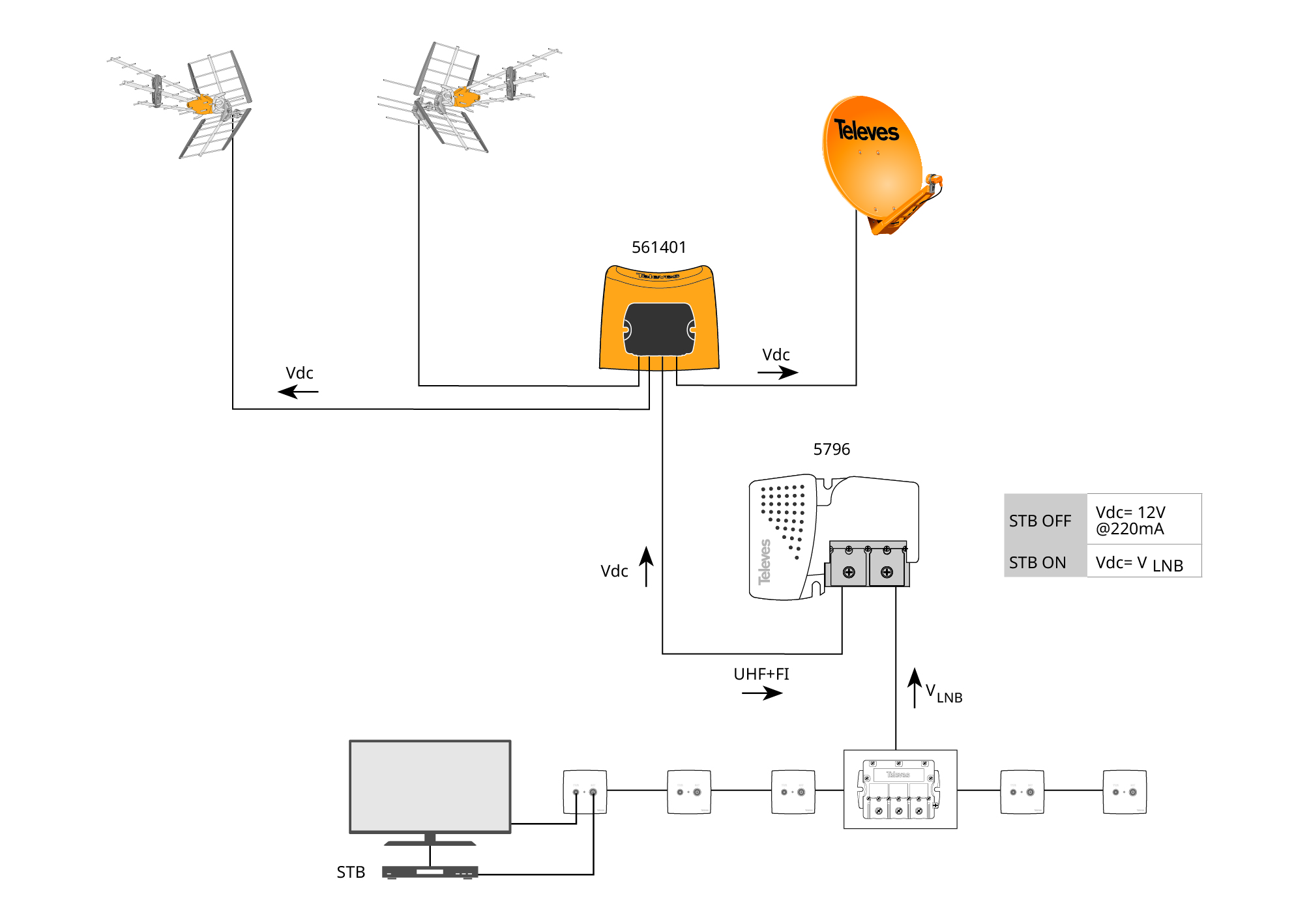 Equipped with 3 inputs: the signals on both UHF inputs are amplified, whereas the SAT signal is only combined.