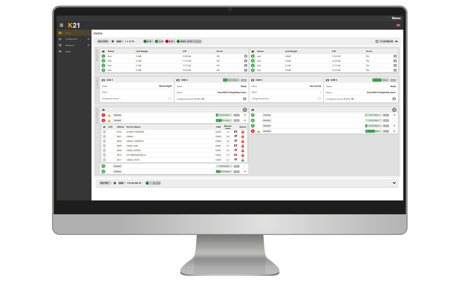 The K21 generates QAM multiplexes from DVB-S/S2/S2X transponder services quickly and efficiently, reducing required cabling and shortening installation time. The entire system is managed through an embedded web interface, accessible from PC, smartphone, or tablet, enabling fast, intuitive configuration through preloaded profiles and installation cloning functions.