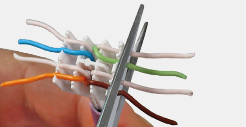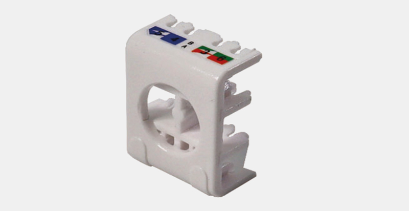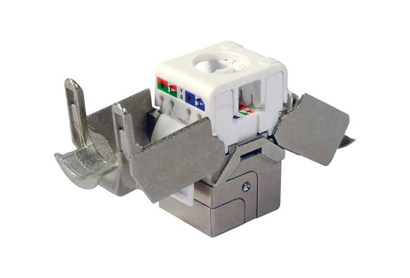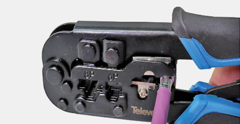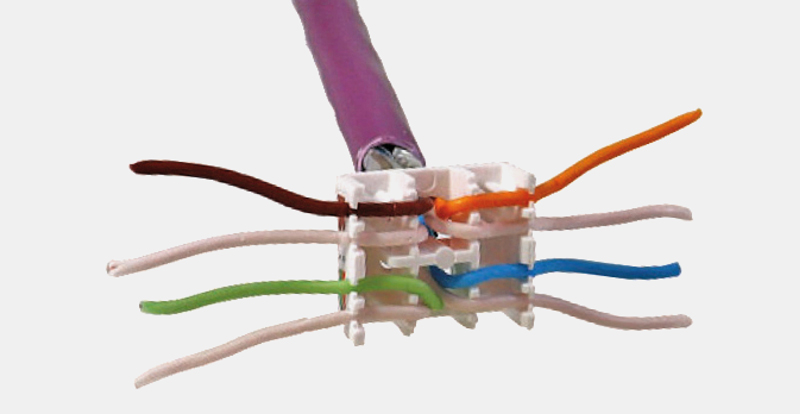 With this type of connector, the crimping is performed with the pressure created by closing the two parts onto the cable by hand. There is no need to use any specific tool to attach the wire pairs to the pins.