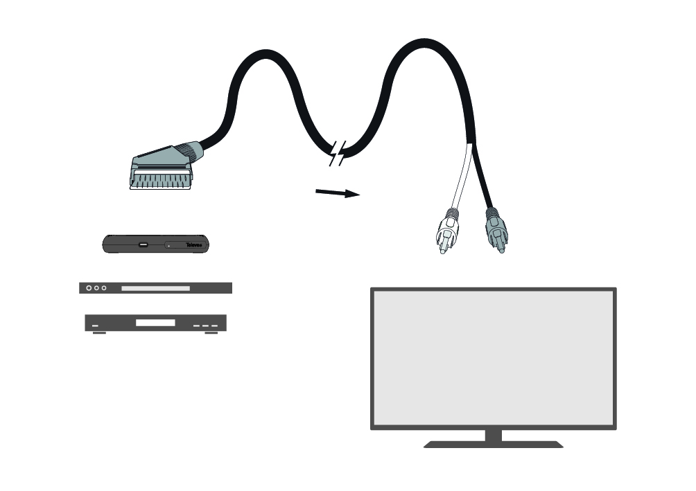 Cable de entrada euroconector en un extremo y salida 2RCA en el otro, para conexión audio/vídeo entre dispositivos (receptores satélite, consolta, etc).