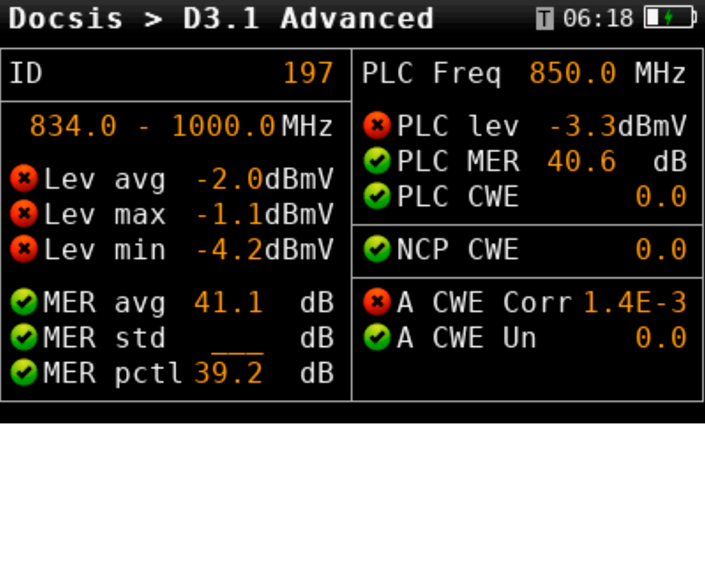 Esta función muestra todas las medidas del canal OFDM DOCSIS. Además de las mediciones de nivel y MER, también se muestran todas las mediciones del PLC y NCP.