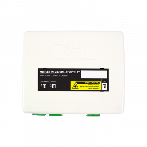 Módulo multiplexor óptico (WDM) 1310/1490 - 1550nm234740Dispositivo pasivo diseñado para multiplexar/demultiplexar dos señales ópticas: una de 1310/1490 nm (GPON) y otra de 1550 nm (RF overlay). Permite optimizar la infraestructura al transmitir la señal de datos de la red GPON y la señal de televisión sobre la misma fibra óptica. También puede usarse para combinar las señales de dos transmisores ópticos Overlight, uno con salida en 1310 nm y otro 1550 nm, transmitiendo así 2 satélites y TDT sobre una única fibra. Su carcasa compacta y resistente permite la instalación en pared o en carril DIN.
