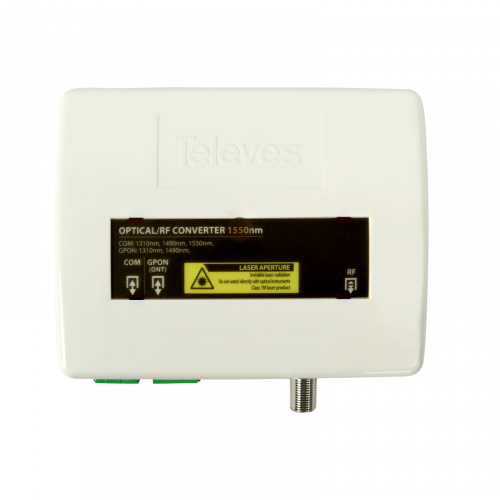 Receptor óptico pasivo, con WDM 1310/1490/1550nm237330Receptor pasivo que recibe una señal óptica sobre una única fibra (1310/1490/1550nm), y la demultiplexa (WDM). La señal TV (1550nm) se convierte hacia una salida de RF (54-2400MHz), mientras que las longitudes de onda 1310/1490nm están destinadas a señales de datos (GPON) para distribuir por su puerto óptico.