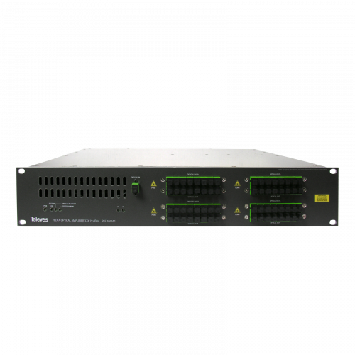 Presenta 8 entradas de 1310/1490nm con las que multiplexa la señal 1550 nm amplificada, ofreciendo 8 salidas 1310/1490/1550 nm, haciéndolo apropiado para la distribución de vídeo en redes ópticas GPON de gran tamaño. A su vez, incluye fuente de alimentación doble, intercambiable en caliente.