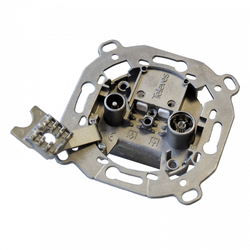 Toma terminal separadora 2 conectores: FM/TV-SAT4301,5226,5276Toma terminal separadora con dos conectores CEI. El de la izquierda es un CEI macho para FM (radio) y TV terrestre y el de la derecha es un CEI hembra para TV satélite (FI).