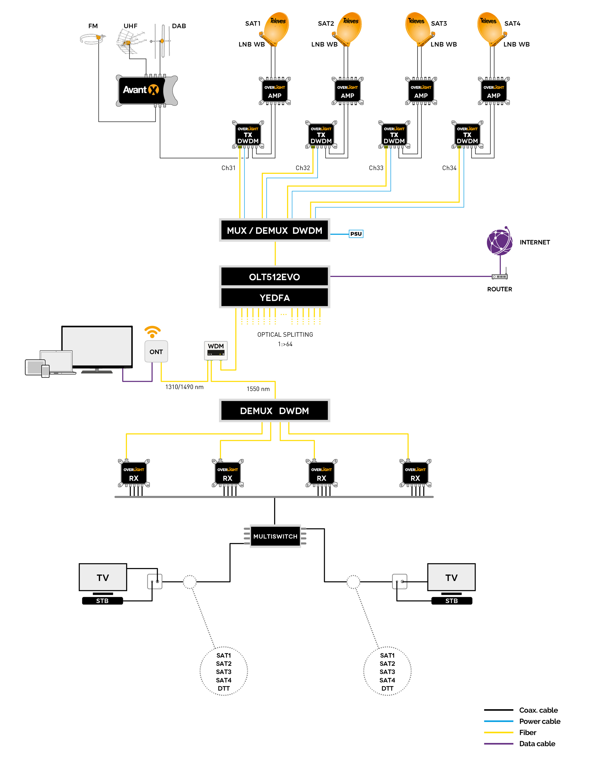 - Compatible avec les émetteurs de la série Overlight pour des solutions de transmission TNT pour plus de 64 utilisateurs à travers une seule fibre optique (amplification nécessaire)