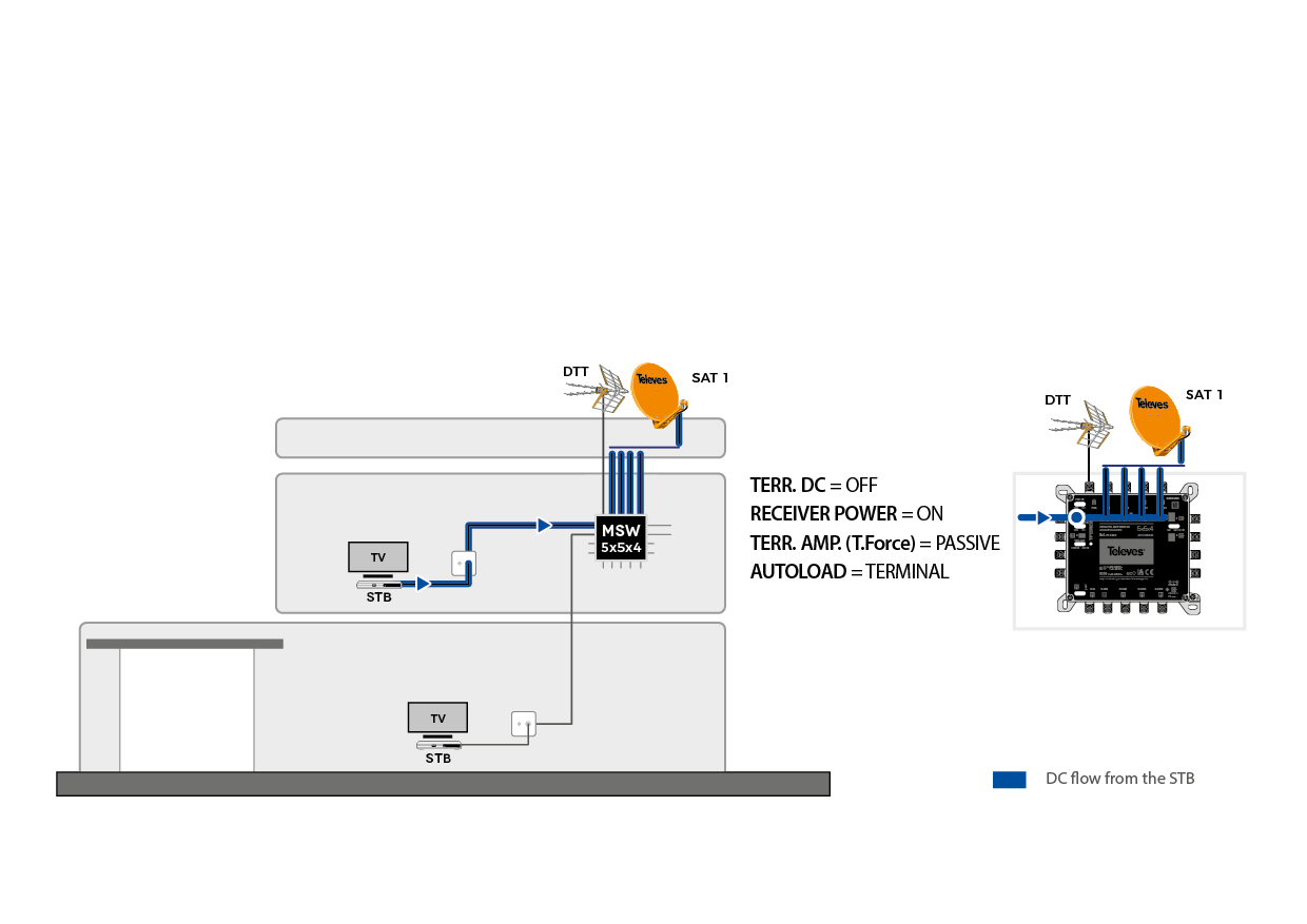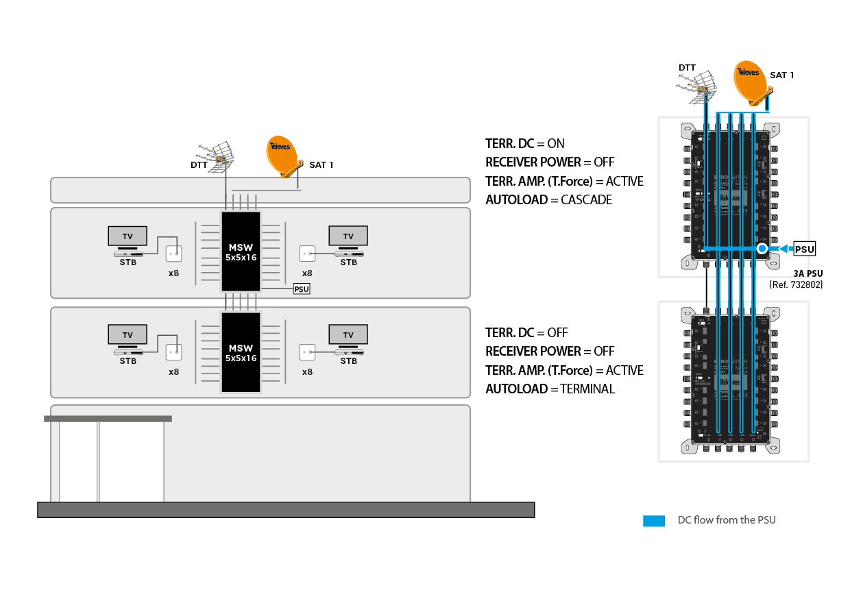 Può essere utilizzato come terminale (tipologia a stella) o come cascata, utilizzando un semplice interruttore. Inoltre, incorpora un secondo interruttore che attiva la tecnologia TForce, che regola automaticamente il segnale terrestre e lo mantiene costante nonostante le variazioni nella ricezione.