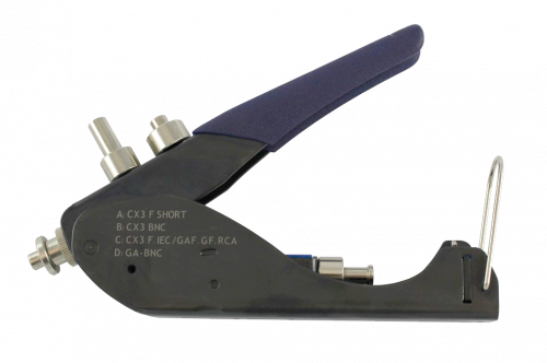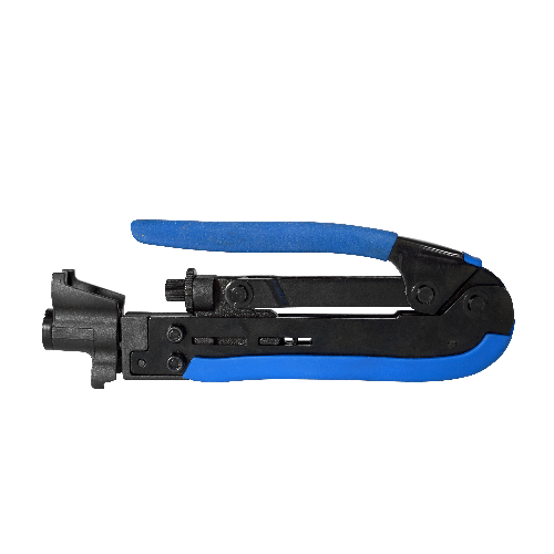 Macchina crimpatrice per connettori "F" a compressione con cavi RG-11216304Strumento in metallo per l'installazione di connettori a compressione di tipo “F”. Consente la compressione di connettori specifici per cavi coassiali di diametro maggiore (RG-11). Grazie al suo punzone rotante, si adatta a diversi tipi di connettori in modo rapido e semplice.
