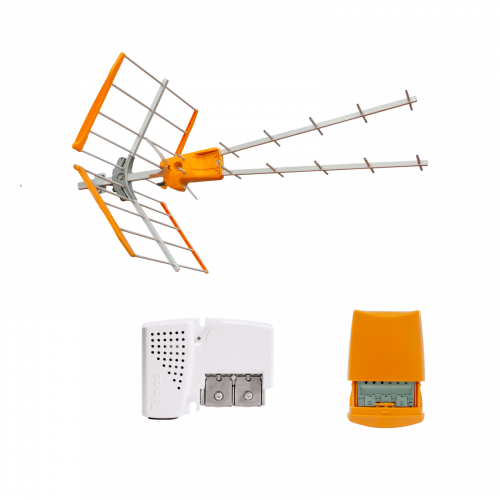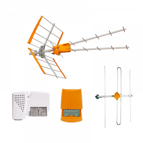 L'antenna VZenit presenta una struttura di tipo "V": composta da due Yagi sovrapoposte verticalmente, permette di raggiungere un buon compromesso tra guadagno e compattezza. Per la ricezione UHF, incorpora un filtro con un elevato taglio nella banda per i canali sopra al 48, senza pregiudicare la planarità della risposta in frequenza della banda per il passaggio dei canali (21-48). Questo la rende adeguata per il 2º Dividendo Digitale (LTE700).Art. 536023: Amplificatore da palo di basso guadagno, 3 ingressi: BIII/DAB-UHF-UHF.