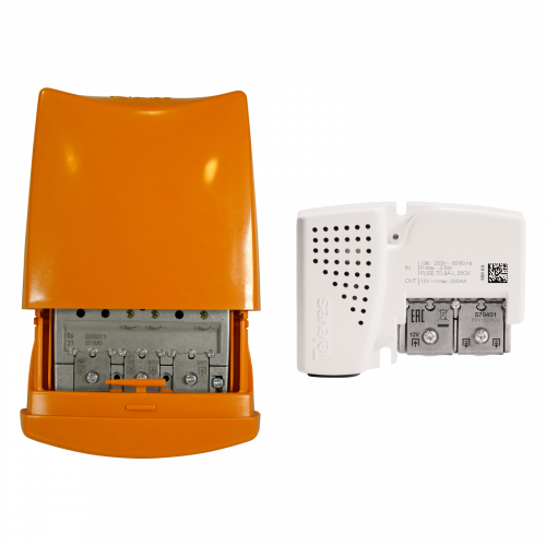 Amplificatore da palo per amplificare i segnali televisivi terrestri provenienti da diverse antenne. Ha 4 ingressi con amplificazione in tutte le bande. La banda UHF è divisa in 2 ingressi, uno per i canali 21 a 31, e l'altro per quelli da 34 a 48. Questo è utile in installazioni per captare due ripetitori, in quanto consente di filtrare i canali che non corrispondono ad ognuno di essi. L'amplificatore si alimenta a 12Vdc attraverso del cavo coassiale d'uscita. RED compliant.Art. 579401: Alimentatore PicoKom, 12V - 200mA, 2 uscite.