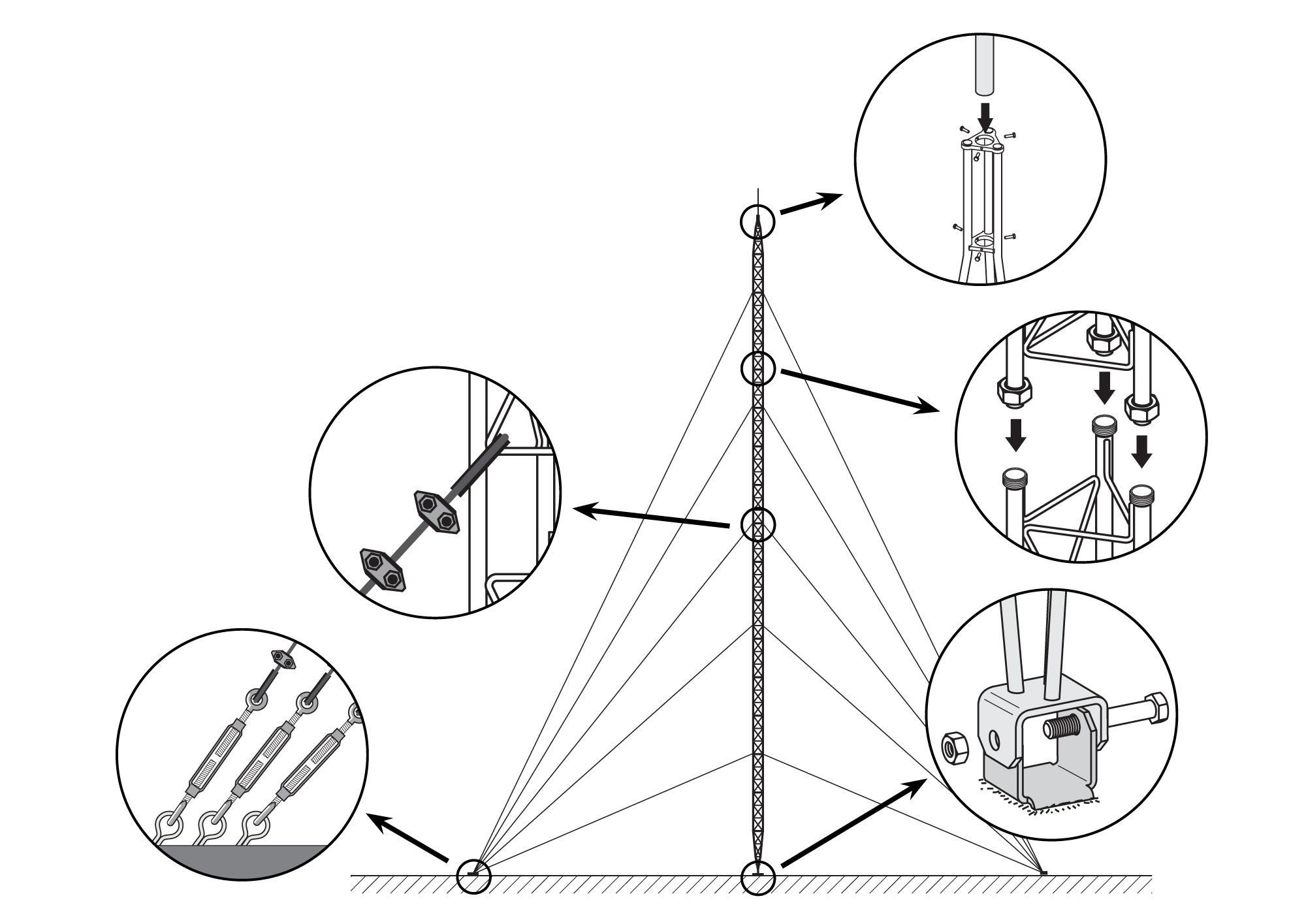 It consists in fixing the lower section to the base, set it in upright position and levelling it. The subsequent Middle Sections are then mounted, equipped with the appropriate guy wires; the mounting is carried out by climbing on the previously mounted sections and hoisting the new section with the help of the appropriate lifting tools.
