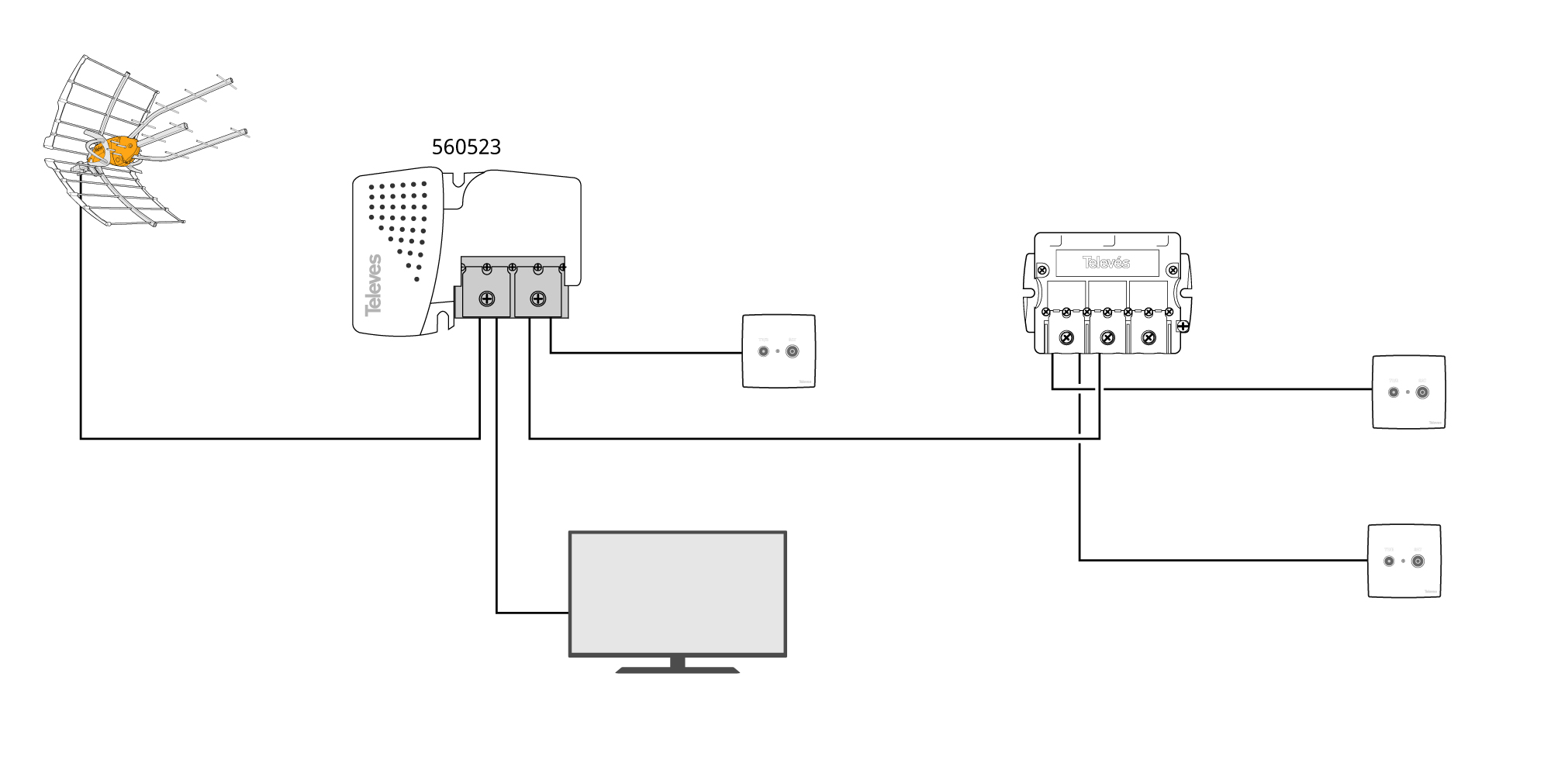 Wyjście TV posiada mniejsze wzmocnienie do bezpośredniego połączenia z telewizorem (bez instalacji gniazda).