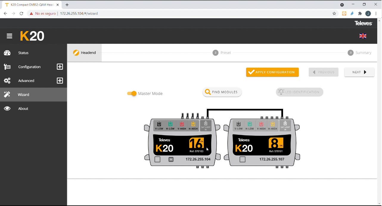 Interfejs zawiera tryb „Kreator” do konfigurowania jednostki lub wspólnej konfiguracji dwóch jednostek w trybie pętli. Oferuje konfigurację krok po kroku, aby zapewnić pomyślną konfigurację, ze wskazaniem urządzenie, wyborem żądanej konfiguracji napięcia wstępnego i podsumowaniem zastosowanej konfiguracji.