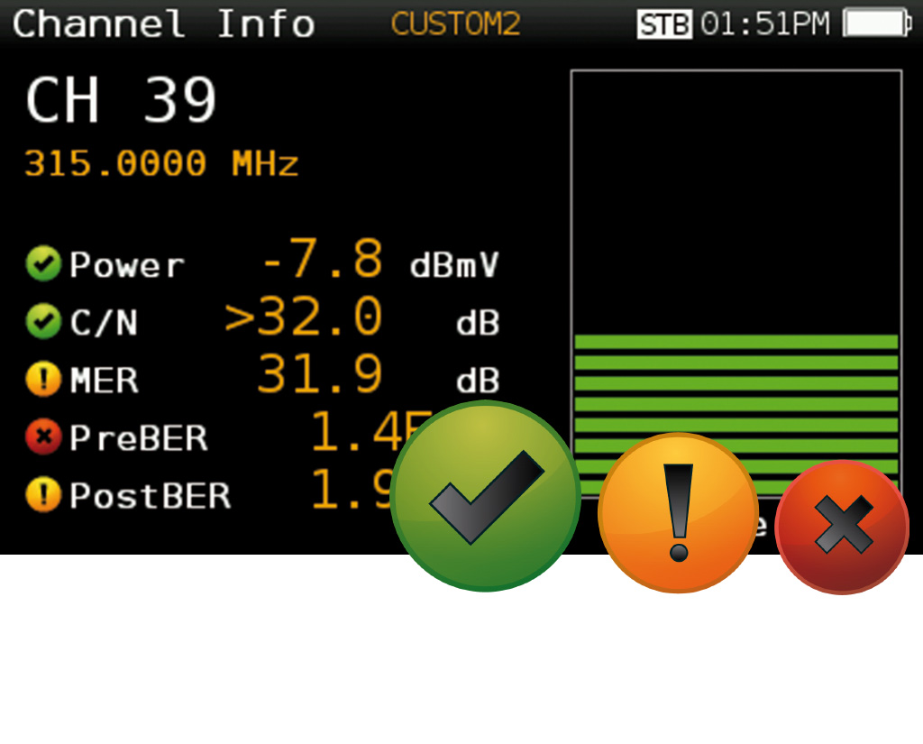 Zmniejsz ilość błędów za pomocą wskaźników OK/Błąd! Dzięki nim łatwiej i szybciej zinterpretujesz wyniki pomiarów. Dostępne są różne progi wskaźników dla poszczególnych lokalizacji: stacje czołowe, wzmacniacze magistralne, odgałęźniki, gniazda, itp. Istnieje również możliwość skonfigurowania progów według własnych potrzeb.