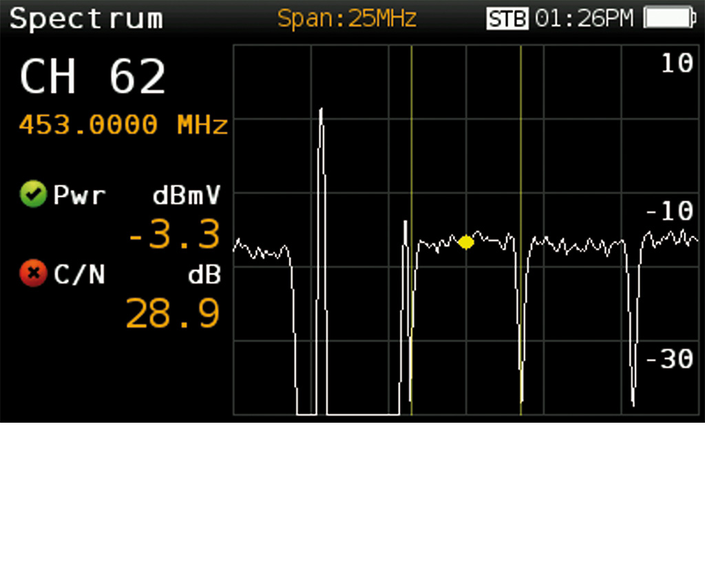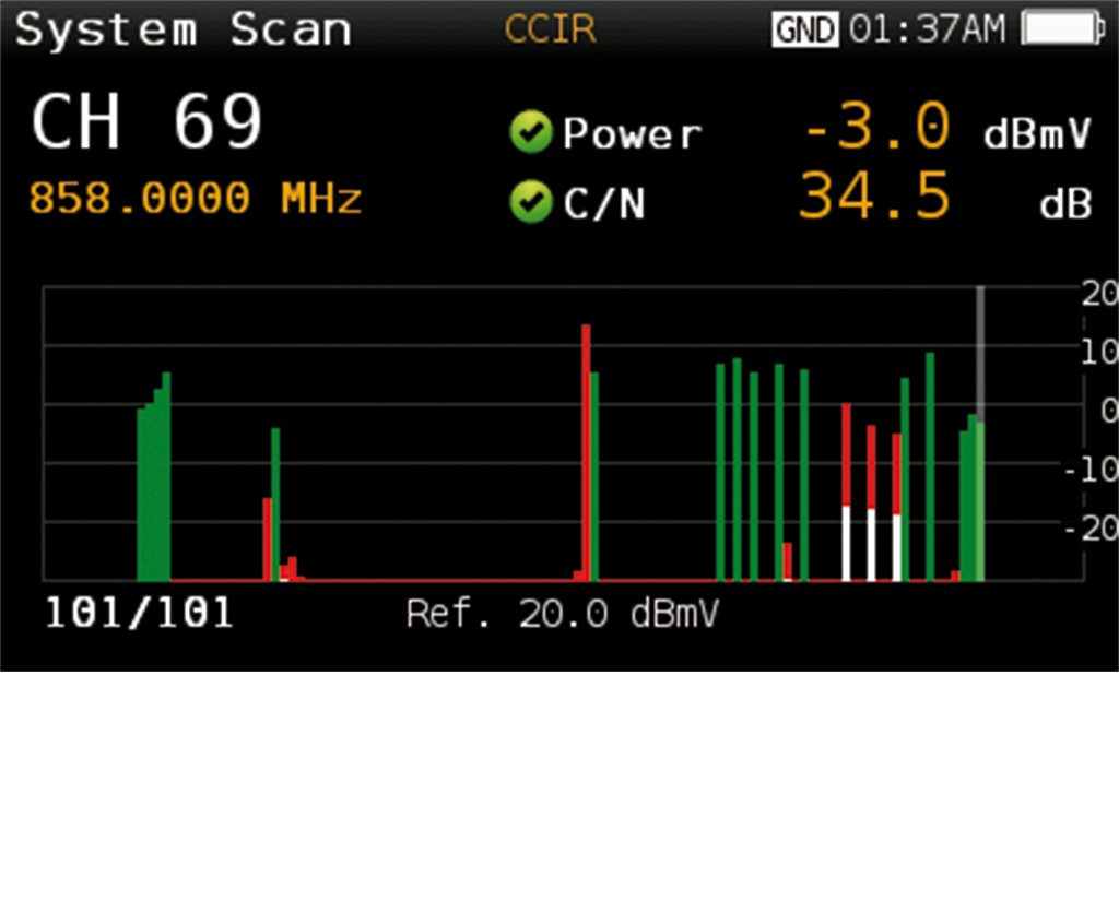 Skanuj w czasie rzeczywistym obecne analogowe lub cyfrowe kanały w celu określenia ogólnej charakterystyki częstotliwości systemu. Pomiar skanowania wykorzystuje lokalizację opartą na progach w celu pokazania czy poziomy sygnałów są zgodne ze specyfikacją systemu – wskaźniki poziomów w kolorze zielonym, czerwonym i żółtym. Łatwy do interpretacji obraz dystrybucji w czasie rzeczywistym, włącznie z wartościami BER oraz MER dla określonych kanałów.