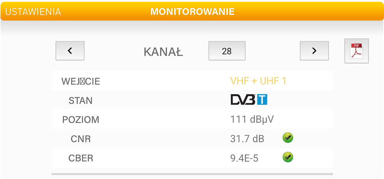 Monitorowanie: w modelach PRO możemy w przypadku każdego filtra możemy określić, czy na skonfigurowanym kanale nadawana jest transmisja DVB-T lub DVB-T2 i sprawdzić jej parametry jakościowe. Możemy również wygenerować raport PDF z konfiguracją, kanałami i pomiarami.