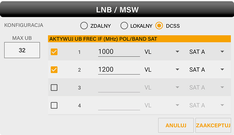 - Zdalny: to odbiornik podłączony w dalszej części dystrybucji wybiera polaryzację, której żądamy od LNB lub MSW.