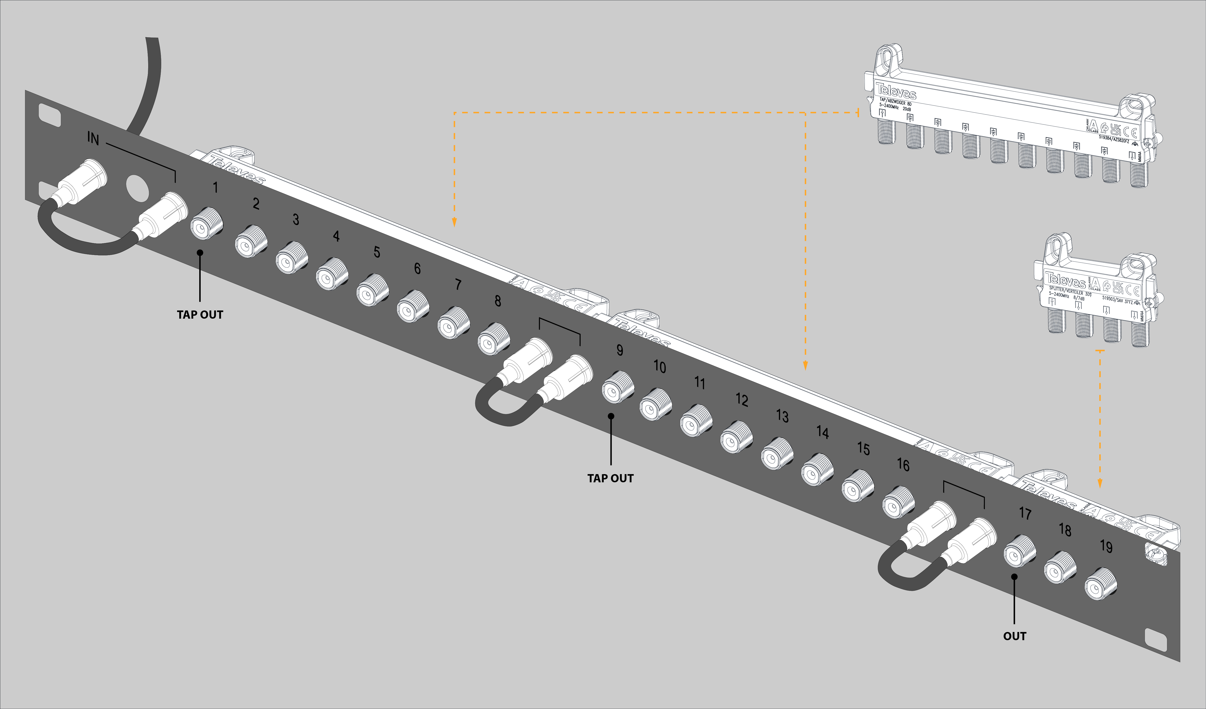 Especialmente desenhado para instalar repartidores e derivadores da série F, pois tem a mesma distância de separação entre os conectores que os dispositivos desta série.