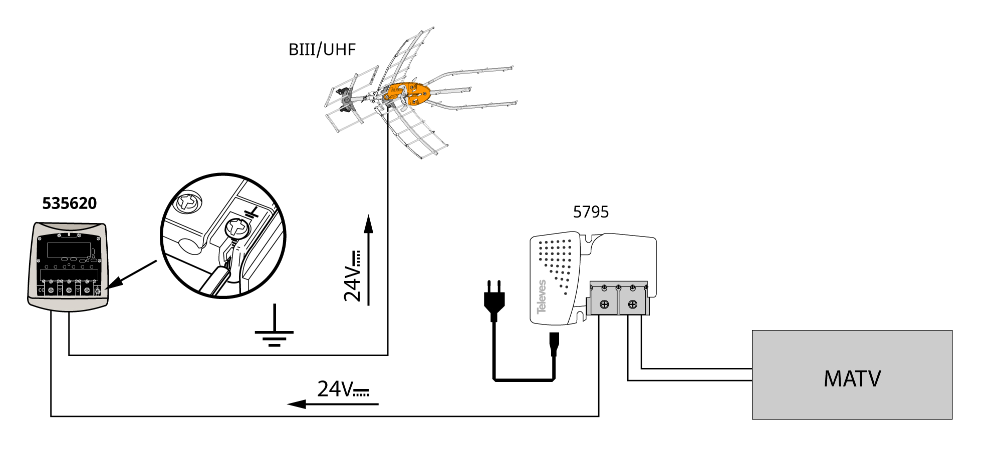 Possui 1 única entrada com amplificação em diversas bandas. O amplificador é alimentado a 24Vdc através do cabo coaxial de saída.