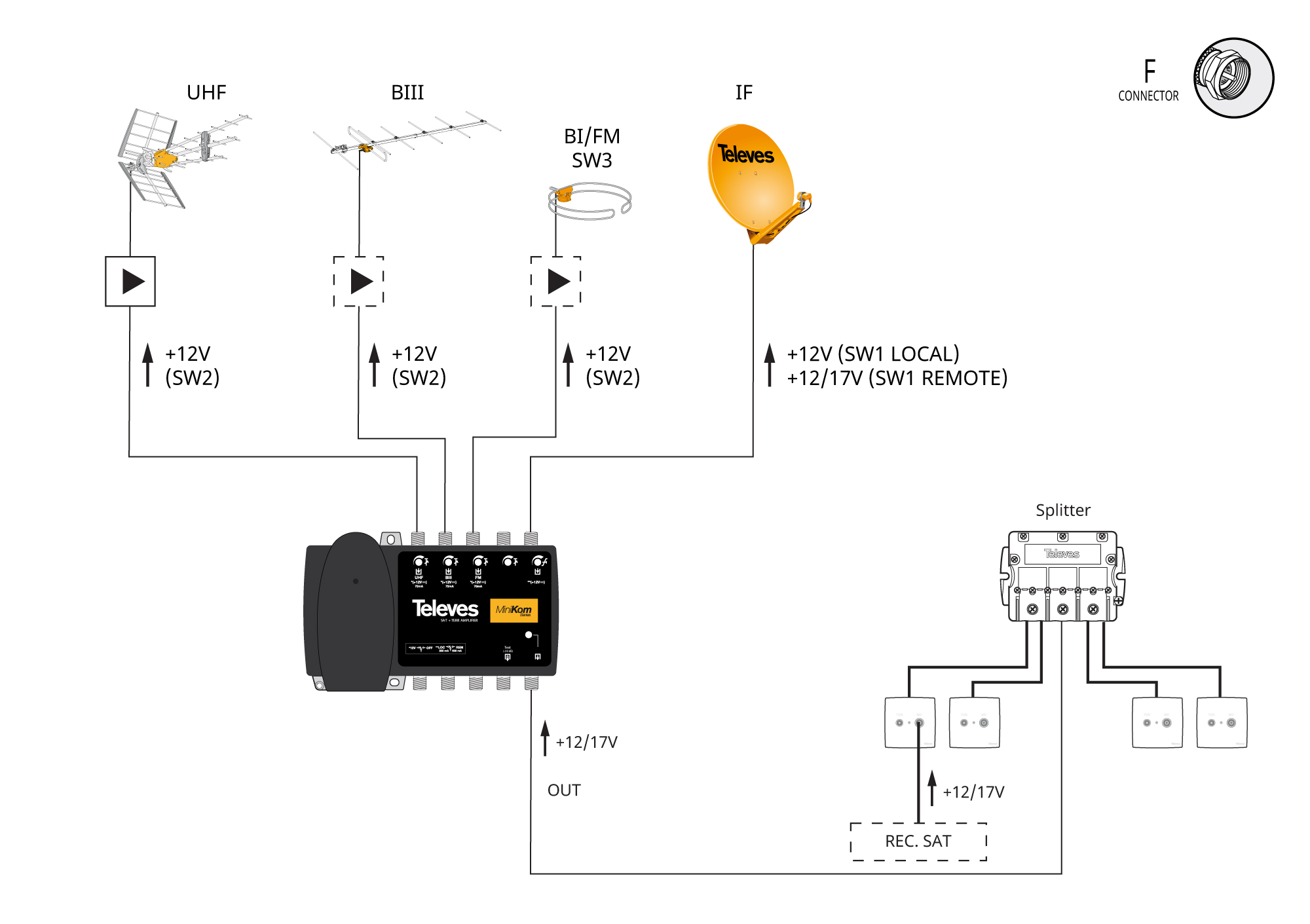 MiniKom F broadband multiband amplifier 4 inputs: FM-BIII-UHF-SAT
