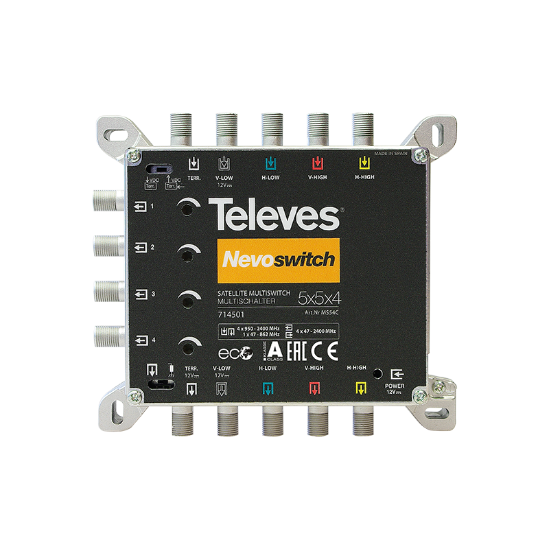 Universal and flexible series that allows the reception of up to 4 different satellites besides the terrestrial signal, suitable for small, medium and large installations. Scalable range of multiswitches with European design, quality and manufacturing. Zamak chassis to ensure an outstanding shielding, and very compact in size to allow mounting on multiple sites. Stands out for the reduced power consumption and the versatile topology (star or cascade on the same equipment).
