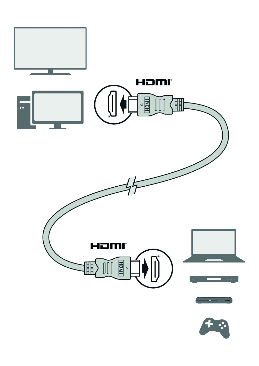 Unlike SCART analog cables, HDMI® are data cables which carry digital signals between generators (BluRay, PC, DDT or SAT HD Receivers, etc.) and TVs through its different conductors.