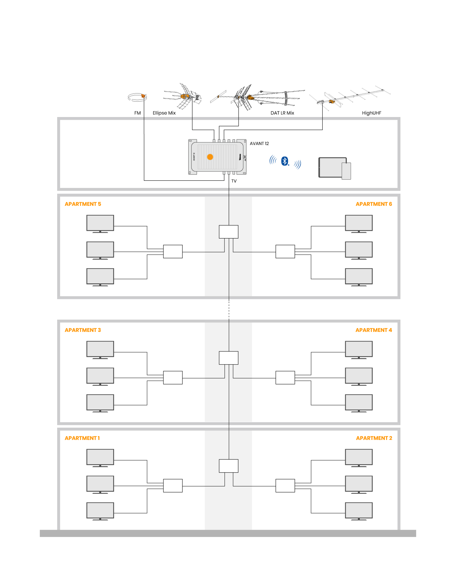 Multi-input multiband amplifier, perfect for individual or MDU (Multi Dwelling Unit) terrestrial installations, that allows individual programming of channels available on 4 LowVHF+HighVHF+UHF inputs (OTA TV), in a total of 32 digital filters. The multiband amplifier has 6 inputs: FM-4x[LowVHF+HighVHF+UHF]-CATV, and can achieve programmable amplification and balancing of the different RF inputs. This device allows channelling selection (off-air or CATV) of the output signal, providing the benefict of being able to mix OTA signals with those coming from a CATV headend. In addition, it includes automatic filtering of LTE-telephony signals, making the device discriminate by itself the programming of the filters up to channel 36 (LTE600) or 51 (LTE700).